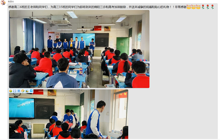 永远年轻,永远热泪盈眶。时光从未对任何人宽容以待,但是少年的岁月总是充满无尽的惊喜和活力。希望高2019级的同学们拿着学弟学妹们精心准备的小礼物,能够在三诊的考试中平静心态,考出优异的成绩,希望高2020级的同学们能够感知未来的呼唤,能够如学长学姐一般,坚定理想,不负所望。