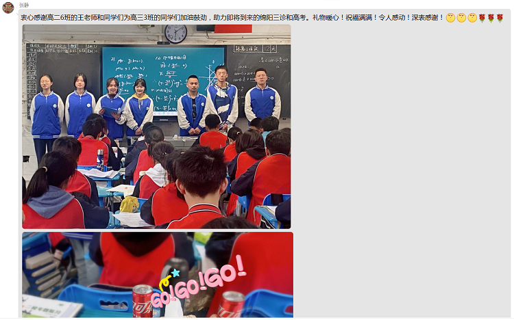 2022年4月上旬和中旬,高2020级以班级为单位进行了为高三学长学姐三诊考试加油的活动。在进行加油活动之前,各班积极为学长学姐准备了小礼物。有些班级为学生学姐准备的是“橙子”,寓意“心想事成”,有些班级准备的是虎年限定的可口可乐,寓意“虎虎生威”,有些班级准备的是写满心意的卡片——