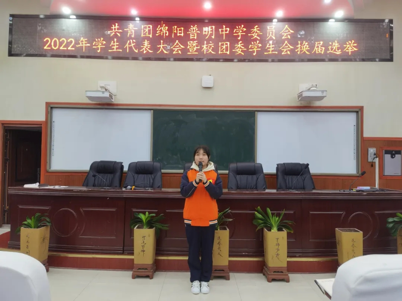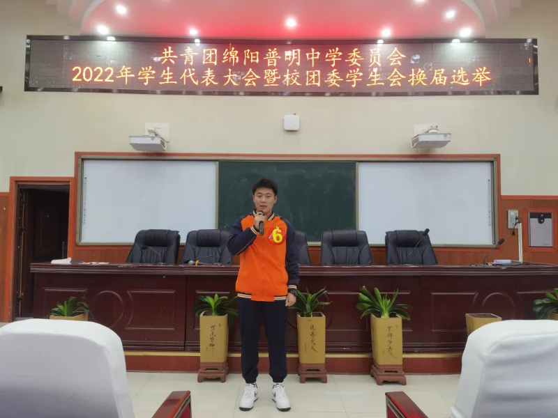 绵阳普明中学2022年学生代表大会暨校团委学生会干部换届选举大会在庄严的国歌声中拉开了帷幕。党委委员、副校长王德广指出学生干部是学生群体中的骨干分子和精英力量,是师生之间交流沟通的桥梁和纽带,是学校实施教育管理工作的一支重要力量。他向在座的全体成员提出了以下四点要求和希望。