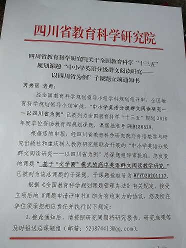 全国教育科学“十三五”规划课题“中小学英语分级群文阅读研究—以四川省为例”子课题立项证书