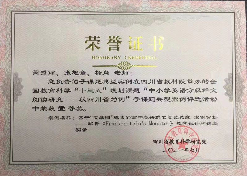 全国教育科学“十三五”规划课题“中小学英语分级群文阅读研究—以四川省为例”子课题在四川省典型案例评选活动中荣获一等奖