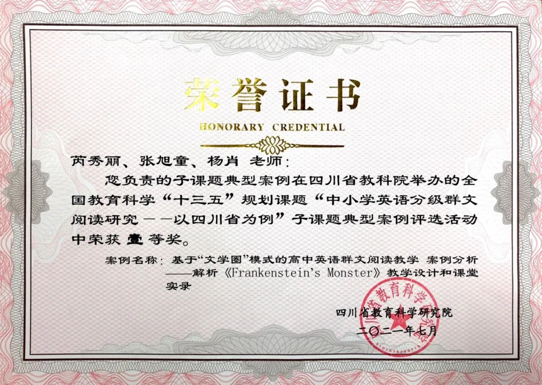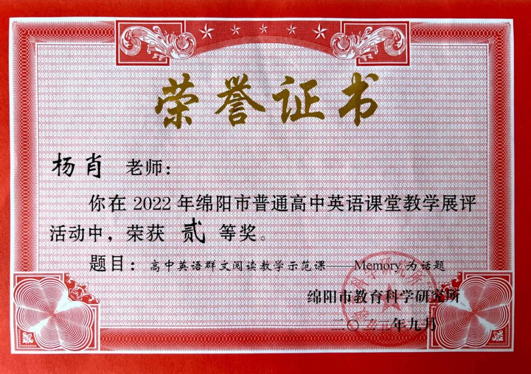 作为一名党员教师,杨肖同志牢固树立“围绕教学抓党建,抓好党建促教学”的理念,自觉将党的创新理论所蕴含的立场、观点以及方法融入至教学科研当中。她秉持“教学出题目、科研做文章”的教研理念,深刻认识到教育科研是提升育人质量、服务教育强国战略的重要抓手。她坚持以课题研究驱动教学改革,作为主研人员参与四川省十三五规划课题《基于文学圈模式的高中英语群文阅读教学研究》,其研究成果子课题典型案例荣获省级一等奖。在教学中,她始终坚持理论联系实际,勇于探索创新教法,其教学实践先后获得绵阳市新教材教法课例展评一等奖、绵阳市高中英语优质课展评二等奖及2025年度教学质量评价二等奖,以实际行动诠释了一名党员教师追求卓越、锐意进取的科研精神和专业担当,将学习教育成果有效转化为推动教学高质量发展的实际效能。