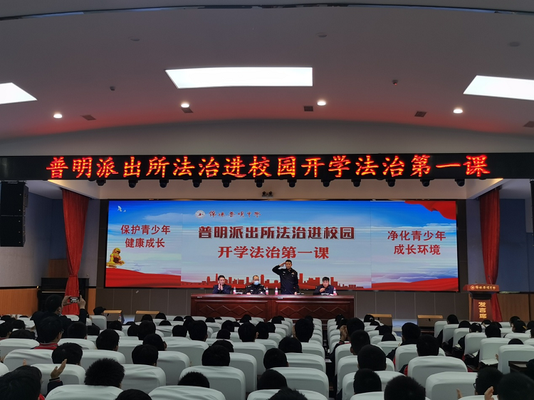 为加大校园法治教育宣传力度,帮助未成年人树立法治观念,提高法律意识,增强自我保护意识,营造文明、平安、和谐的校园育人环境, 2023年3月10日,绵阳普明中学邀请到普明派出所谷乾宏警官为全校学生开展主题为“法治走进校园,筑牢安全防线”的法治教育讲座。此次讲座在冬梅厅举行,政教处傅小柯主任、安全保卫处王建强主任参加了会议,讲座由王建强主任主持。