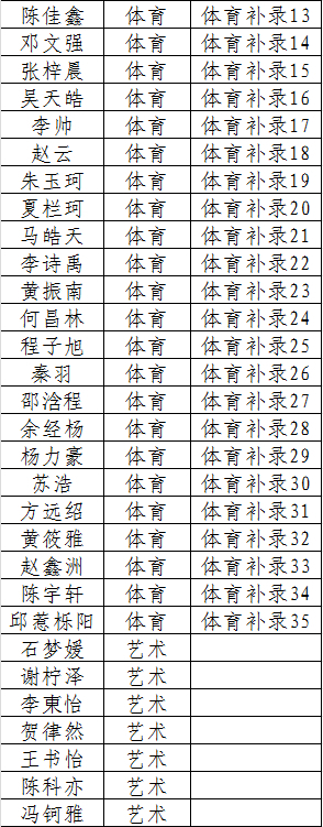 根据绵阳市教育和体育局关于印发《2024年全市普通高中招收体育艺术特长生工作实施方案》的通知(绵教体函[2024]12号)文件要求,普明中学于2024年5月25日完成体育艺术特长生专业测试工作,本次测试严格按照普明中学上报市教体局并公示的招生公告执行,在学校纪委和市体育和教育局体卫艺科的监督和指导下顺利完成,由学校艺体特长生招生工作领导小组最终确定了各项目拟录取名单。于5月29日上报市教体局体卫艺科,经市教体局审核复查普明中学拟录艺体特长生名单信息、考核成绩无误。现将普明中学2024年体育艺术特长生拟录取名单公示如下: