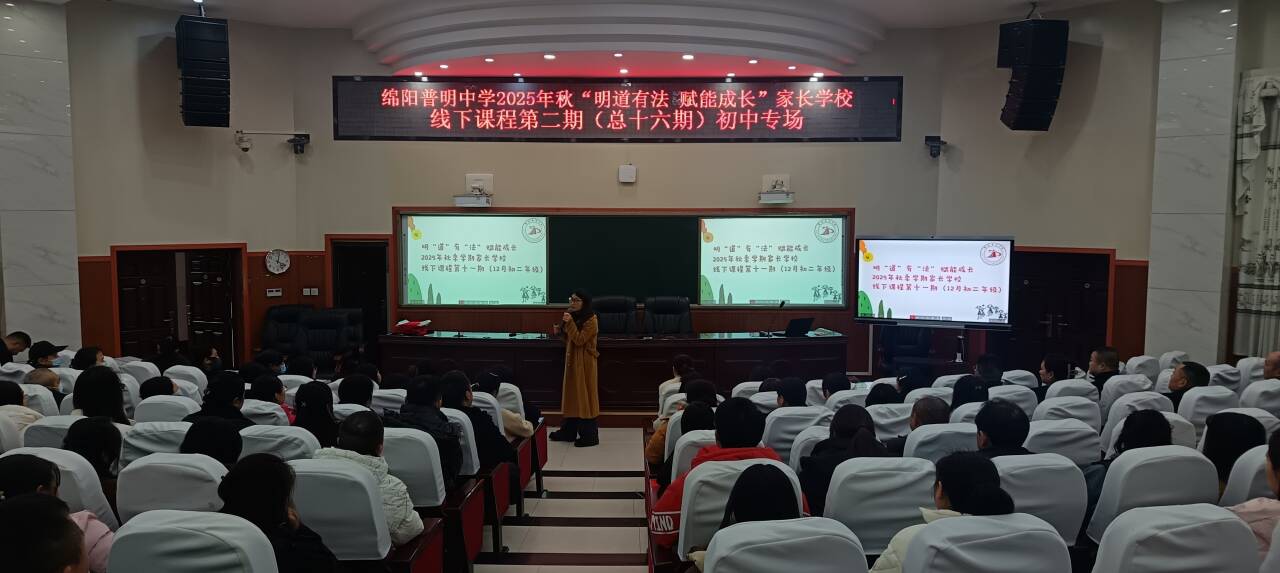 家庭是孩子成长的第一课堂,家校协同是护航青春之路的重要基石。初二作为褪去懵懂、迈向独立的关键过渡阶段,高二作为学业进阶、蓄力冲刺的核心赛道,两个学段的孩子均面临着成长蜕变与学业提升的双重挑战,而唤醒内在动力、搭建良性亲子沟通桥梁,成为这两个阶段家庭教育的核心命题。为精准对接不同学段家长的育人需求,提供科学实用的教育指引,绵阳普明中学 2025 年秋季学期家长学校线下课程(第二期)总第十六期,分别开设初中专场与高二年级专场,学校专职心理教师窦新月老师、李攀老师应邀分别主讲,为初二、高二家长们量身打造了两场干货满满的成长赋能课堂。