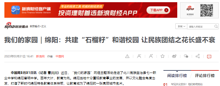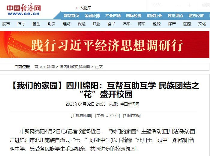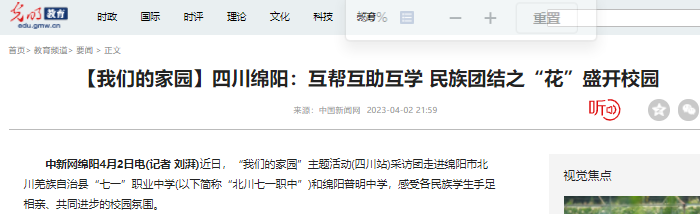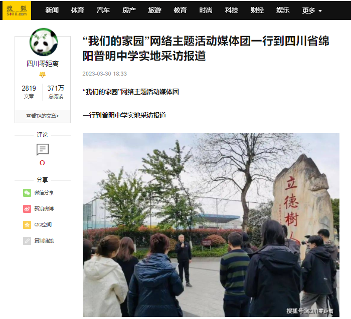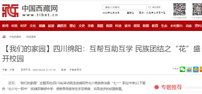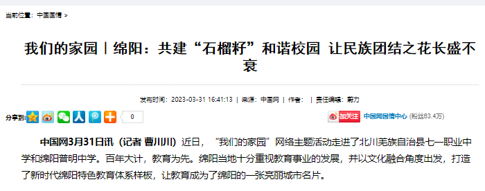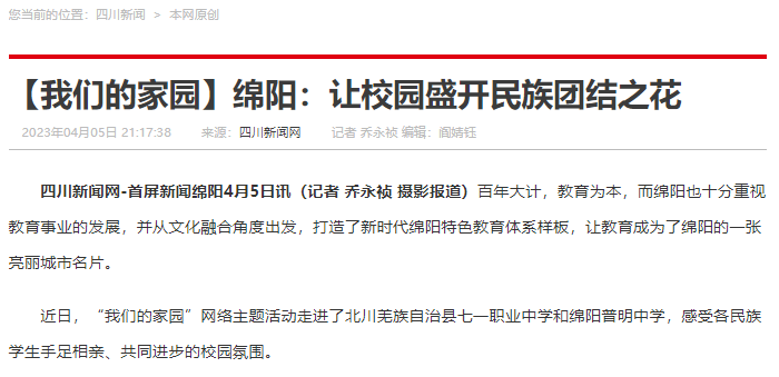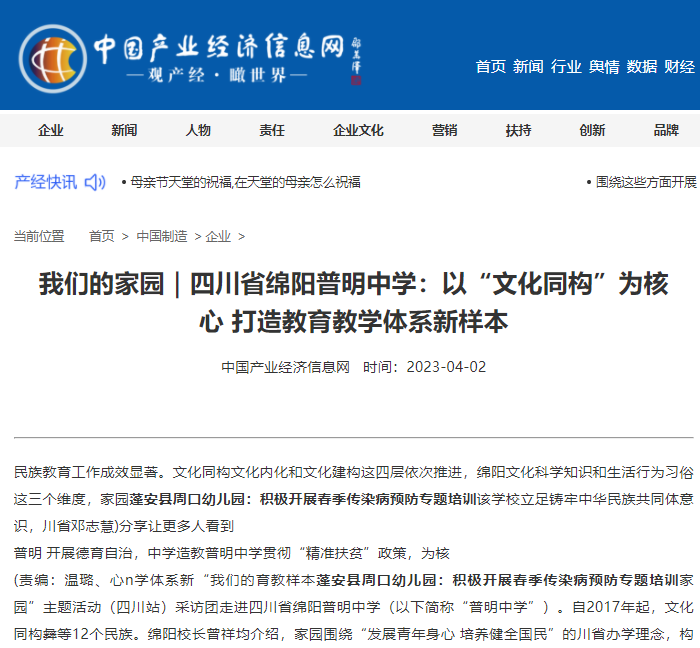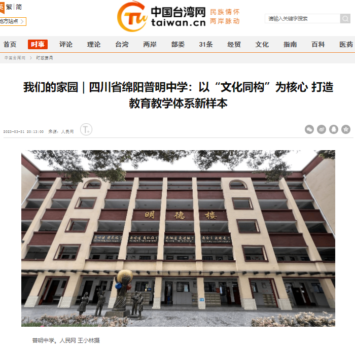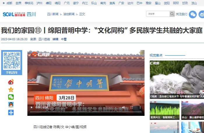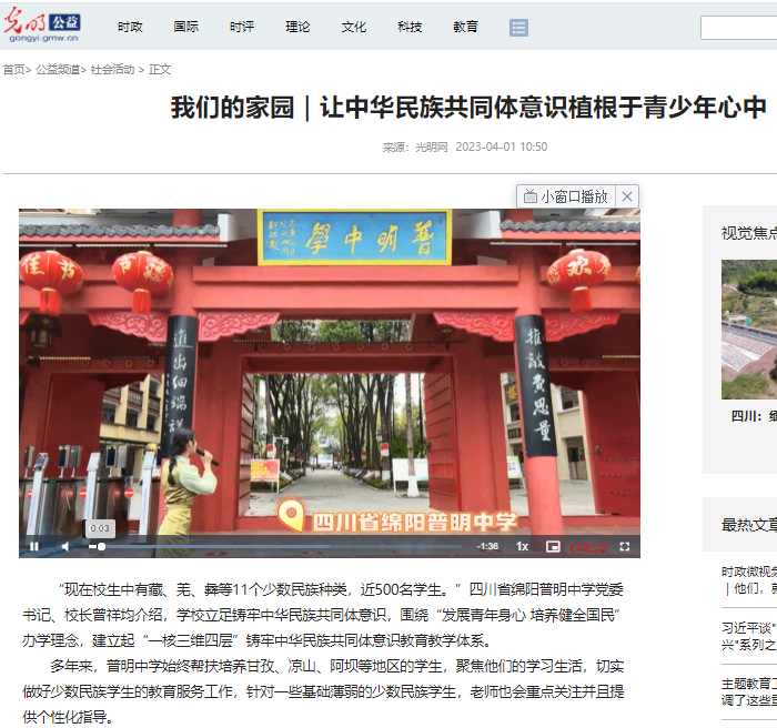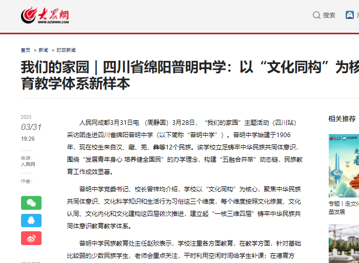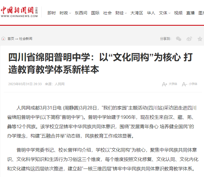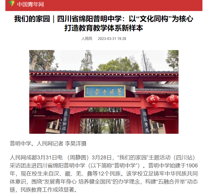 3月28日,由中央网信办网络传播局指导,四川省委网信办、西藏自治区党委网信办、人民网主办的“我们的家园”网络主题活动走进绵阳普明中学,共有来自人民网、新华网、央视网等11家央级媒体和川观新闻、封面新闻、四川观察等6家省级媒体组成采访团报道我校铸牢中华民族共同体意识工作,普明中学党委书记、校长曾祥均向采访团介绍了我校“一核三维四层”铸牢中华民族共同体意识教育教学体系,多家媒体争相报道,其中人民网的报道《我们的家园|四川省绵阳普明中学:以“文化同构”为核心 打造教育教学体系新样本》受到全网转发,引发广泛热议。