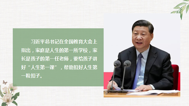习近平总书记在全国教育大会上指出,家庭是人生的第一所学校,家长是孩子的第一任老师,要给孩子讲好“人生第一课”,帮助扣好人生第一粒扣子。