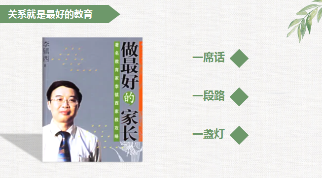 “走心”的陪伴可以是全身心的投入和孩子共同做一件事情,李镇西老师就主张父母每天都能够和孩子有“一席话”“一段路”“一盏灯”,所谓“一席话”就是陪孩子聊聊天,“一段路”就是陪孩子散散步,“一盏灯”就是与孩子灯下共读。在“走心”的陪伴中,父母能了解到更真实的孩子,理解孩子想法,懂得孩子的需求,也能赢得孩子发自内心的信任,让亲子关系更为融洽。人本主义心理学家罗杰斯说:“关系就是最好的教育。”有了良好的亲子关系,教育就在无形中发生着。