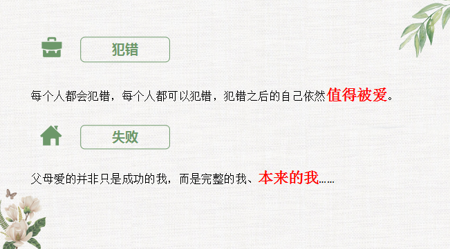 如果当孩子犯错时,家长向孩子传递的信念是:每个人都会犯错,每个人都可以犯错,犯错之后的自己依然值得被爱;当孩子遭遇失败时,家长能让孩子感受到:父母爱的并非只是成功的我,而是完整的我、本来的我……孩子的内心就能生长出勇气和力量,抗挫的能力就在不断增长。在这样的家庭中成长起来的孩子定是坚韧的、具有蓬勃生命力的幸福之人!