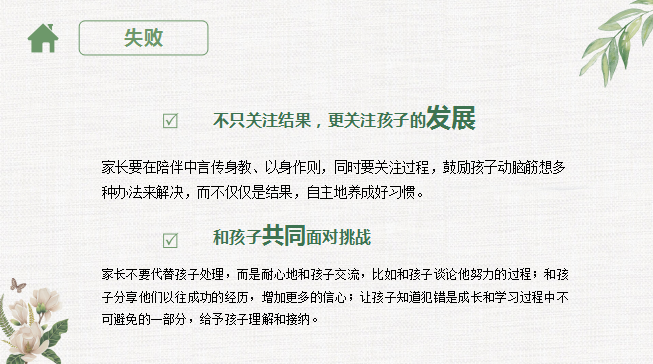 孩子在成长中会面对困难和失败,比如考试成绩不理想、和同学发生矛盾等,这时家长不要代替孩子处理,而是耐心地和孩子交流,比如和孩子谈论他努力的过程;和孩子分享他们以往成功的经历,增加更多的信心;让孩子知道犯错是成长和学习过程中不可避免的一部分,给予孩子理解和接纳。面对困难的时候要多用“我们”这个词,比如问孩子:“我们可以怎么做?”“我们”意味着支持,表明不论好坏,我都和你站在一起,共同面对问题。