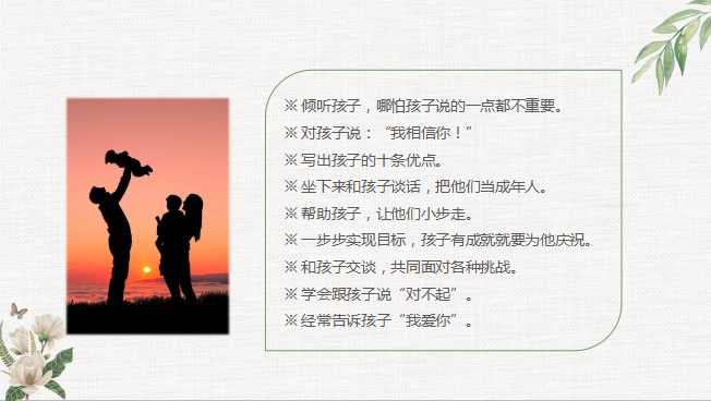 父母唯有一颗积极向上的心,才能经常鼓励孩子。想要给孩子真正意义上的鼓励,父母就必须看到孩子身上的优点,以积极的心态对待生活,不但要相信孩子,更应该把这种信念传递给孩子。另外,父母还应该让孩子知道,不论发生什么,爸爸妈妈都有信心认为一切都会好起来。只有这样,孩子才会不断地成长,发现和看到更好的自己。
