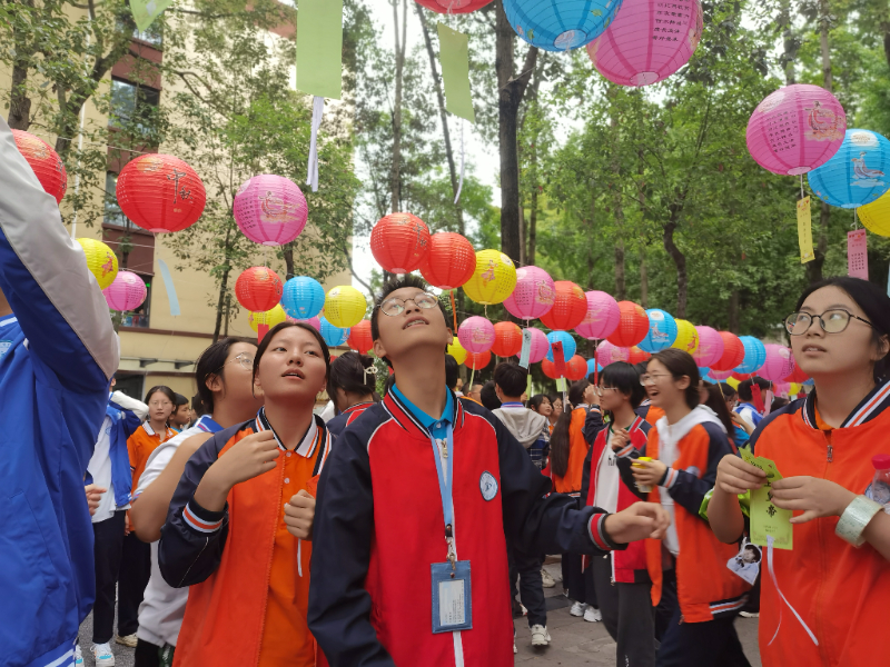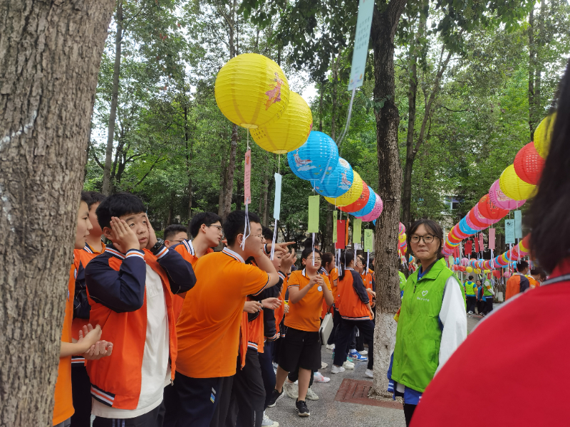 活动伊始,各年级广泛宣传,认真组织,全校师生积极参与。9月26日,华英路、育德路、凝祥路、音乐广场挂满五颜六色的灯笼,每个灯笼下悬挂有关中国优秀传统文化的灯谜,下午6:00-7:00,全校师生迫不及待进入活动现场,拉开了猜谜活动的序幕。只见有些同学眉头紧锁,突然眼前一亮,露出灿烂的笑容,赶紧扯下一张谜面纸条到学生会志愿者处核实,答案正确的,当场领取纪念奖品一份。